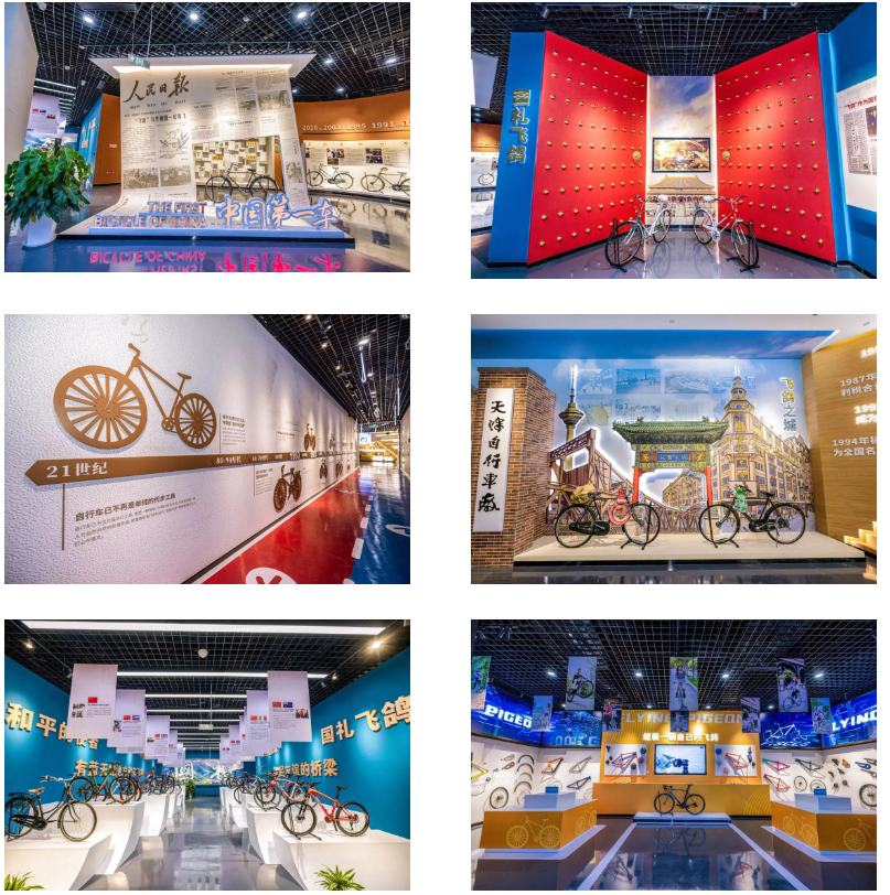 飞鸽品牌文化馆位于梅江会展中心,展厅总面积1150平方米,分为前厅、序厅、民族品牌、国礼飞鸽、时代记忆、守正创新、蓝色梦想七大篇章,是一座承载着天津工业文明记忆的城市会客厅,是面向全国开放的飞鸽自行车品牌文化交流中心。